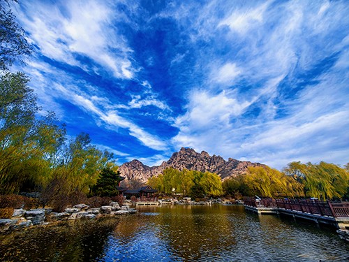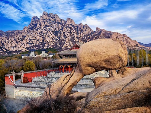 天涯海角在海南,天涯地角在原平。早在唐朝时期,诗人雍陶就曾写下“十年马足行多少,两度天涯地角来”的诗句,这描写的正是原平的“陆上天涯”天涯山。在原平市区向东南方向眺望,群山之中,几座光秃秃的黄褐色山峰异常醒目,这里便是天涯山景区所在地。走入其中,一幅由奇峰、怪石、美景、诗文共同编织的北方山水画卷徐徐展开。“冬天下雪时,四周的山被白茫茫的大雪覆盖,唯独这座山几乎不挂雪。因为它非常陡峭耸立,落雪点非常少,像有人扫过一样”,景区讲解员韩重钢指着海拔1117米的天涯主峰,向《经济》记者介绍起了“天涯扫雪”的自然奇观。在高大的天涯山西侧山脚下,两座莲花状的小山峰赫然撞入记者眼帘,靠南的那座山峰像含苞欲放的莲花,东西走向的山脊恰似微微拱起的莲瓣;北侧山峰则像绽放的莲花,流畅的曲线在阳光下泛着温润光泽。“这是数亿年前形成的花岗岩,经过地壳运动和风雨侵蚀,才雕琢出这样的奇观。”韩重钢说。而在南侧莲花山脚下,便是原平八景之首“风吹石鼓”,端详可见一块巨石身形庞大,尾部渐细,由山体岩石上生出,斜跨数米,中间形成一个硕大空间,致使两端支撑点极小,凌虚而架,摇摇欲坠,就像一只巨大的鼓锤在锤击着大地。“每逢大风穿谷,气流通过鼓锤下的大‘笛孔’,就会听到阵阵‘鼓声’,奏响千年不绝的大地乐章。”韩重钢说。