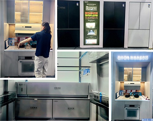 时至今日,厨房设备可以变得多贴心?在一家家电卖场的厨电展区,一台最新的数字厨电让记者眼前一亮,它不仅可以通过手机APP远程操控,更能实时监控烹饪进度,下载专属APP后,洗碗机、蒸烤箱等设备也可纳入智能管理系统。“这款超薄款嵌入式厨电顶部储物柜设计完美契合小户型需求,将有限空间转化为立体收纳系统。”据现场负责人赵腻腻介绍,这款集功能性与装饰性于一体的数字厨电,不仅是工业设计的突破,更是空气动力学的创新实践,其所配备的抽油烟机,可以手势感应操控。记者在现场体验时,向右挥手,抽油烟机的吸力瞬间加大,向左挥手则变小。“采用类似集成灶的近吸原理,核心在于智能增压系统的精准调控,当公共烟道压力突变时,可以实时监测烟道阻力,即便在烹饪高峰期也能保持畅通无阻。最大排风量可以达到29立方米/分钟,有效防止油烟倒灌。”赵腻腻说。除此之外,灶具的材质设计也颇费心思,磨砂质感面板取代传统钢化玻璃,既规避了指纹残留的困扰,又兼具防油污特性。赵腻腻现场演示时,喷上油渍的表面,经湿布轻拭便焕然一新,与之形成互补的是可拆卸式灶具设计,更容易打理,“特别适合有洁癖的家庭主妇”。