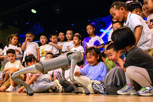 甘肃省张掖市甘州区第八幼儿园科技大篷车嘉年华活动上,萌娃在近距离与“机器狗”互动 作者:杨潇 / 来源:中经视觉