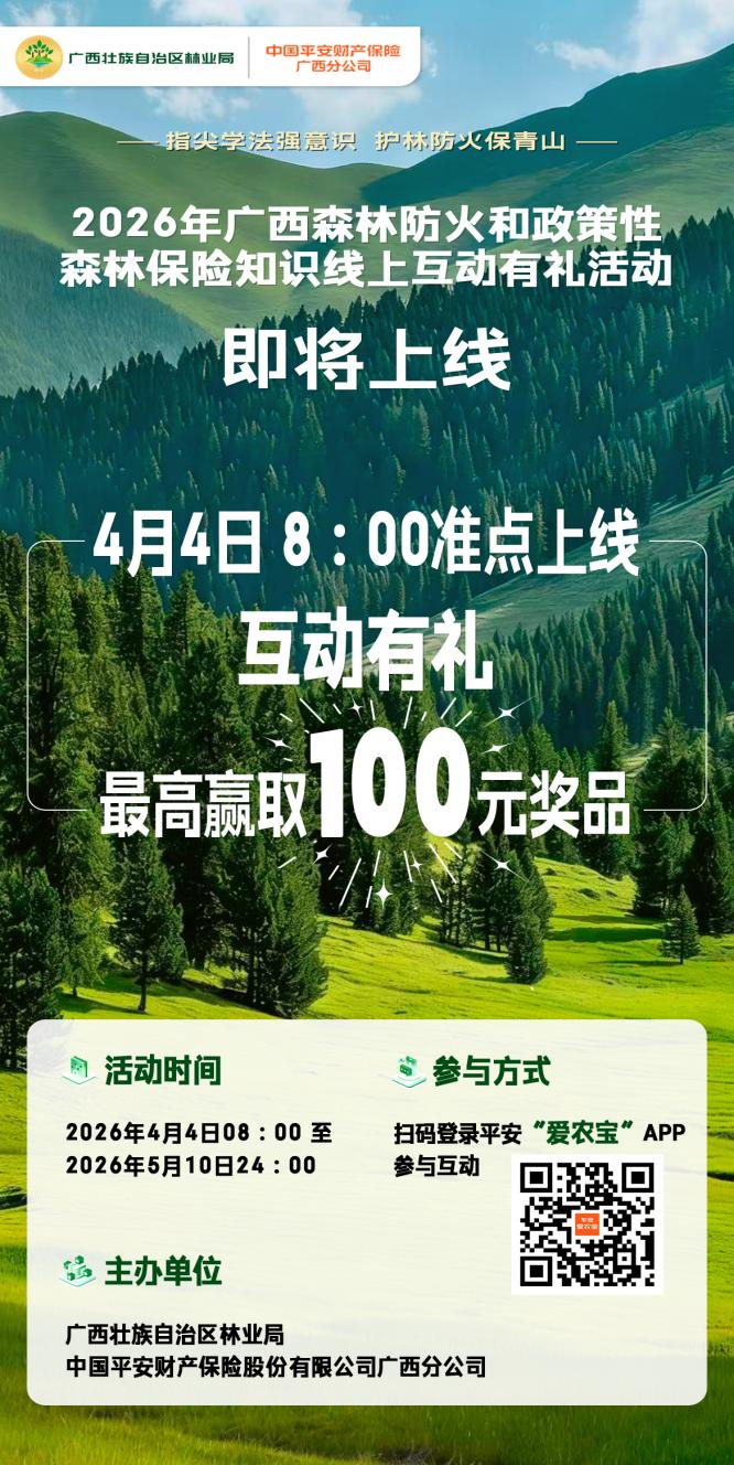 为广泛普及森林防火与政策性森林保险知识,切实增强全民防火和风险保障意识,织密织牢森林火灾防控人民防线,广西壮族自治区林业局联合中国平安财产保险股份有限公司广西分公司推出森林防火和政策性森林保险知识线上互动有礼活动,2026年4月4日至5月10日邀广大群众线上学知识、赢好礼。