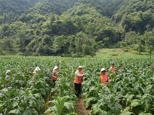 图为烟叶生产期间向勇和专业服务队在烟田打顶抹杈