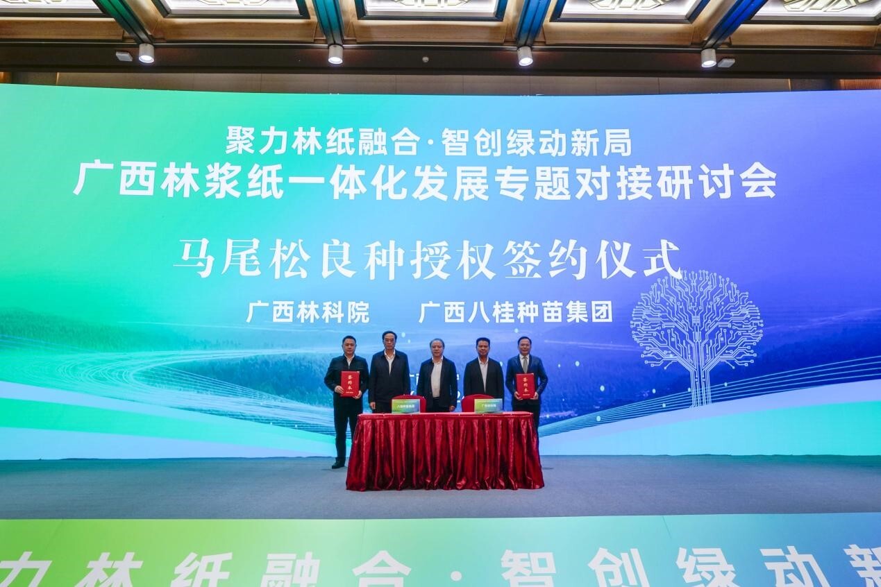 会议现场举行的签约仪式成为一大亮点,共达成三项重要合作协议:广西林科院与广西金桂林业签订华玉相思新品种授权协议,与八桂种苗集团签订马尾松良种授权协议,与派阳山林场签订针叶纸浆原料林基地建设战略合作协议。此次签约将加速林业良种成果的快速转化应用,推动原料林基地标准化、规范化建设,进一步完善林浆纸产业链条,助力产业协同发展。