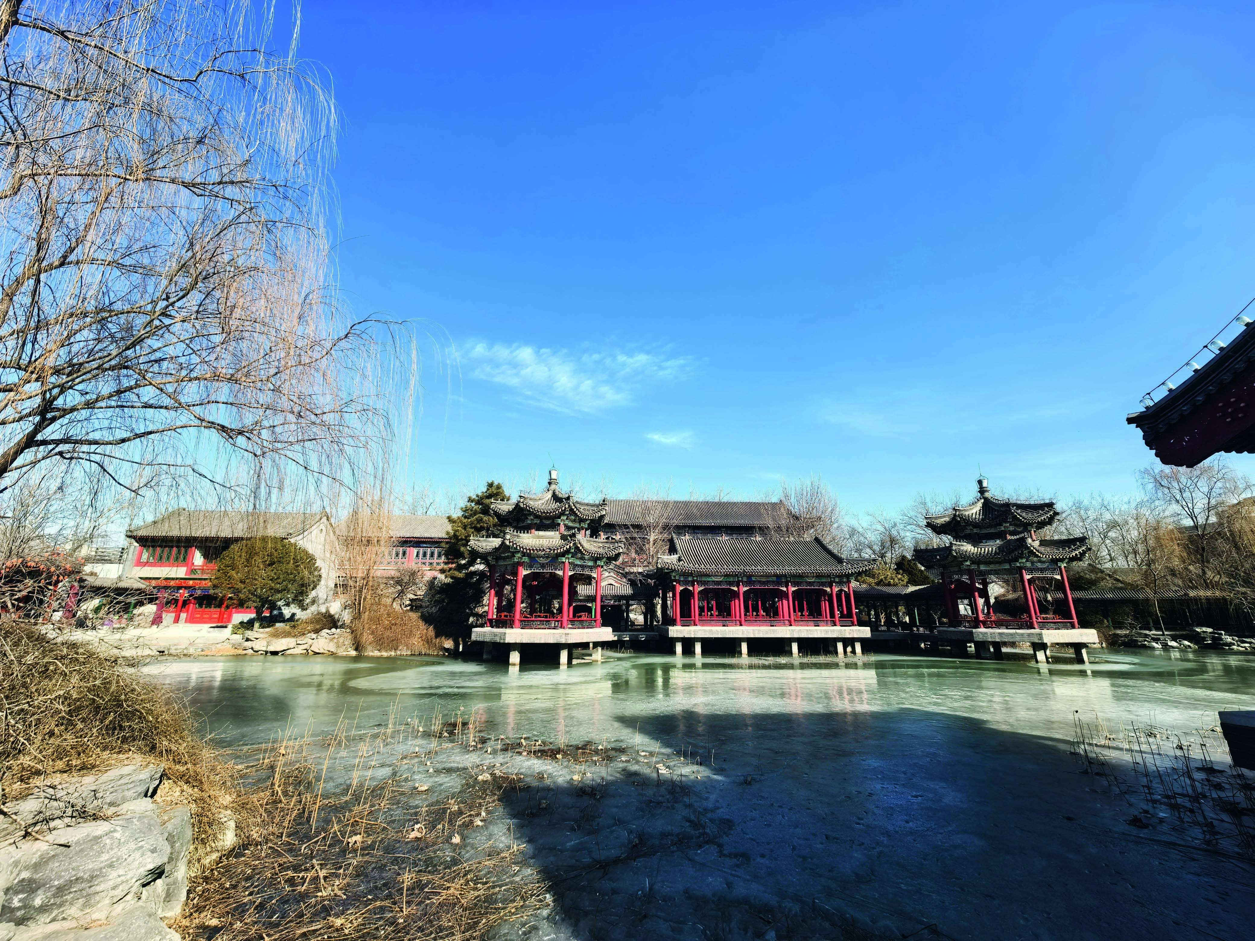 行走于王府,红墙绿瓦,湖石叠翠,高高挂起的红灯笼,有的垂挂在树上,有的像串串糖葫芦,映衬着黑色金字的匾额;身着汉服的小姑娘漫步在石桥,惊起屋檐上的铜铃——叮当作响;冰面待消的湖心亭畔,但见早梅正含苞。一簇绿意盎然的竹子探出深灰色屋顶的弧形门楼,与湛蓝的天、洁白的门廓,形成一幅三色合一的动人图景。阳光洒在门楼的白墙上,门内隐约的庭院景致,让人遐想,仿佛只需跨过这道门,就能从喧嚣步入静谧。古今交融的错位感,便是这郡王府里最动人的地方——它不声张,却在不经意间,让人与三百年的光阴打了一个照面。