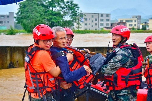 龙南市杨村镇车田村低洼处的被围困群众陆续被救出转移到安全地带。 叶波 / 摄