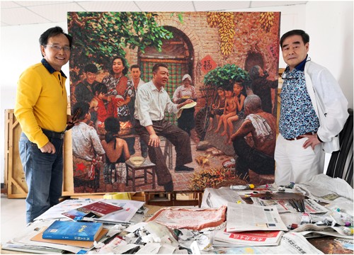 王建顺(左)在创作《益友》期间与作品中故事的经历者王国胜(右)进行交流。许金源提供