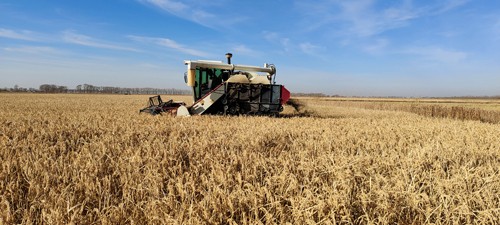 讷河市大型收割机正在田间作业