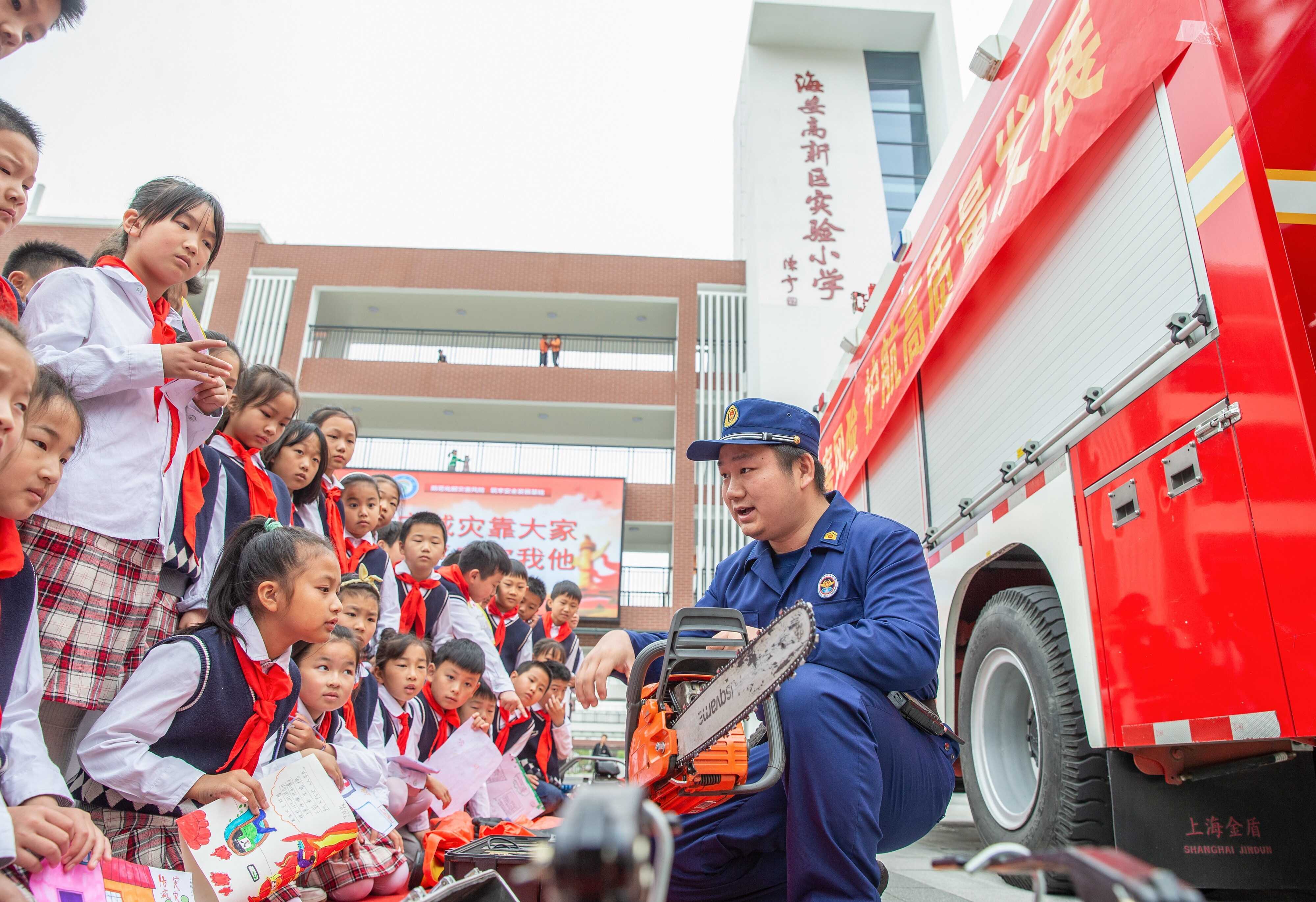 学生们在听消防队员介绍消防器材的使用方法。来源:中经视觉