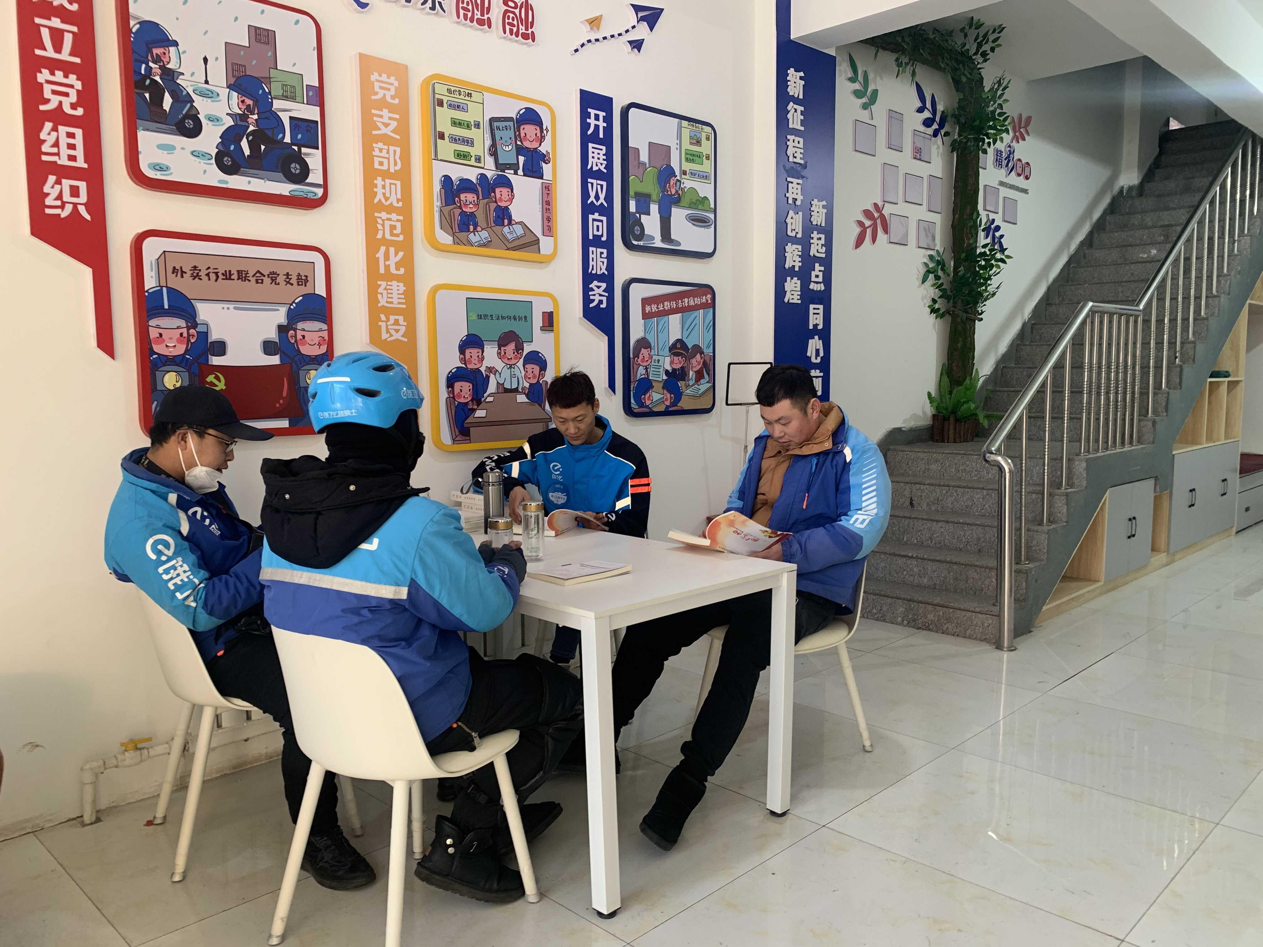 外卖骑手在网格驿站临时休息交流经验