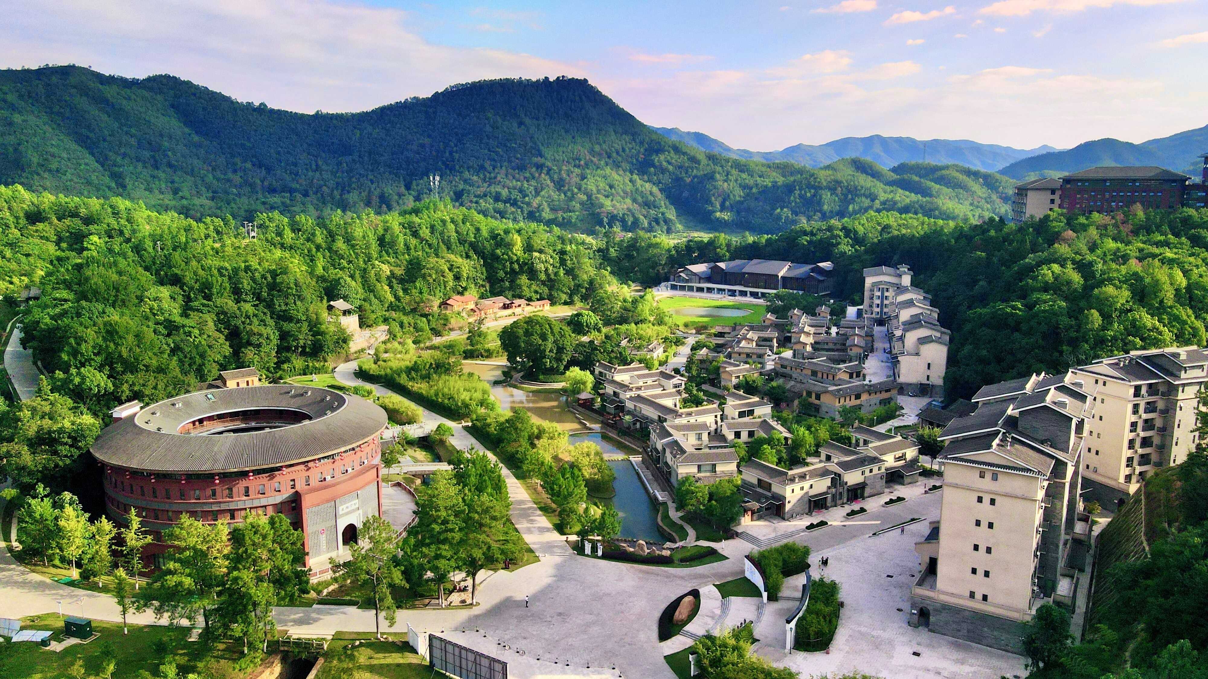 时至今日,会昌戏剧小镇每到周末、节假日或者有明星戏剧上演时,人群均川流不息。今年1月开镇以来,小镇共举办了近500场戏剧演出、文化活动,一些来自意大利、法国、西班牙等地的剧团到此与中国观众见面。同样,在距离会昌县约40公里,位于“乡下”的和君教育小镇虽隐居深山,却早已“出圈”。走进这个小镇,记者看到,在梓坑村周边近10平方公里的青山绿水间,一座现代化的职业教育学院耸立在山巅,四周是兼具客家特色和都市风格的围屋酒店、办公大楼、耕读村落、商业街区,包括蜜雪冰城、四叶咖啡等也一应俱全,俨然一副“林中有城、城中有林”的景象。沿着小镇主体盘山而上,6.9公里之外的三度书院是一个更加幽静的田园场所,这里群峰环抱,林海莽莽,绿波荡漾,林间飞瀑缓缓飘落,宛如人间仙境。取自辛弃疾“我见青山多妩媚”诗句的“妩媚阁”,是三度书院的前台与大堂,其状如书似阁,四周雕阑刻诗,尽显文化底蕴。书院街错落有致,石板铺路,沿街布局着各式客房,以词牌名命名,书院内的建筑别具一格,青砖、黛瓦、夯土墙,古朴典雅,与周围的自然环境和谐相融。据和君小镇文旅负责人魏红波介绍,三度书院由20多栋建筑组成,总建筑面积约1.3万平方米,周边有20多个小型瀑布,清澈的溪水会沿着溪谷流淌到山下的耕读村,平日里耕读村的游客溯溪而上,徒步两个多小时才能走到这里。“这里不仅是一个书院,更是一个高端的学术交流平台,曾经吸引了不少学术大咖前来讲学交流,包括多位院士。”