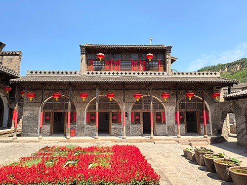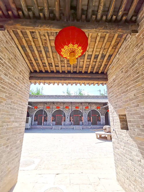 建于明清年间、位于临县碛口偏东北处的孙家沟村,是一个独特而山明水秀的小山村。整个村子四面环山,中间形成一个盆地,四季长流水的小河从村中间流过,把村子一分为二。站在半山腰上,可以清晰地看到,整个村子就像一个莲花盆,弯弯曲曲的小河就像一根莲花茎,长在莲花盆中间。孙家沟南部片区有号称“山西最大四合院”的王家“十三连院”明清古建筑群,13个四合院,院套院、窑连窑。整体布局高低错落有致,完整记录了晚清至民国初期中国北方黄土丘陵地区农村的真实面貌,使人们能够感受当时黄土高原的窑洞村落、明清建筑、民居文化和建筑艺术。近年来南北两大片区共18套明清古院落,全部修缮一新。门口挂着的红灯笼在蓝天白云的映衬下,鲜艳而喜庆,就像我国南方地区院落门前的“迎客松”,笑迎八方客。