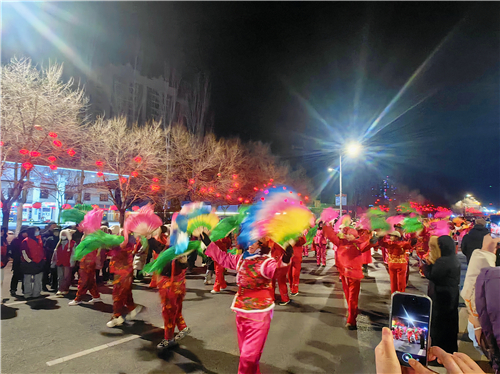 紧随彩车而来的,是18支乡艺表演队伍,舞龙、舞狮、秧歌……这些传统民俗在寒冷的冬夜里焕发出勃勃生机。表演者们身着鲜艳的服装,手持彩绸或彩扇,随着锣鼓和唢呐的节奏翩翩起舞。古风扇子舞别具一格,舞者们手中的扇子如蝴蝶般翻飞,彩绸在空中划出优美的弧线。最引人注目的是舞龙表演,金色的巨龙在舞者们的手中跃然起舞,时而盘旋升腾,时而俯冲摆尾,伴随着激昂的鼓点和铿锵的锣鼓声,巨龙仿佛活了过来,现场掌声、喝彩声此起彼伏,寒冷的冬夜被热情点燃,节日的喜庆气氛扑面而来。