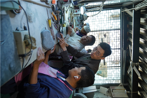 卢广成在车间与师傅探讨制砚所遇问题。摄/赵文
