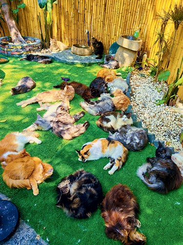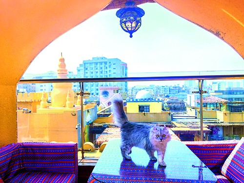 记者抵达“猫街”时,这里正在进行装修改造,工人们有的在搭建屋顶,有的则在精心雕刻猫形雕塑,不停忙碌着。在广阔的楼顶空间,土黄色的泥墙与茅草屋顶构成了一幅异域风情的画面,而半封闭的屋棚内摆放着波斯风格的沙发与床垫,共同营造出独特的氛围,其间,餐厅、咖啡馆、酒吧和烧烤店等配套设施一应俱全。在高处的猫舍中,一只只猫咪站在玻璃窗前,好奇地向外张望。走入其中,东短、德文、柯尼斯等品种的200多只猫咪占据了整个空间,它们对访客的到来并不畏惧,甚至主动前来亲近。“这里的猫咪都是经过精心挑选的,以短毛品种为主,主要是为了配合整体装修风格。”据猫街工作人员王菊芳介绍,平日里到猫街撸猫、团建、打卡拍照的人非常多。“目前正在大规模升级改造,计划今年‘五一’期间正式营业,到时候将会有1000只左右猫咪活动在整个楼顶,客人无论是吃饭还是消遣,都会有猫咪左右相伴。”在王菊芳的描述下,用不了多久,“猫街”将会正式升级为“猫城”,在这座西域风格的楼顶城堡里,不仅有吃有喝有玩,还能亲自体验猫群流动的壮丽景观,四下望去是广阔的城市风景。