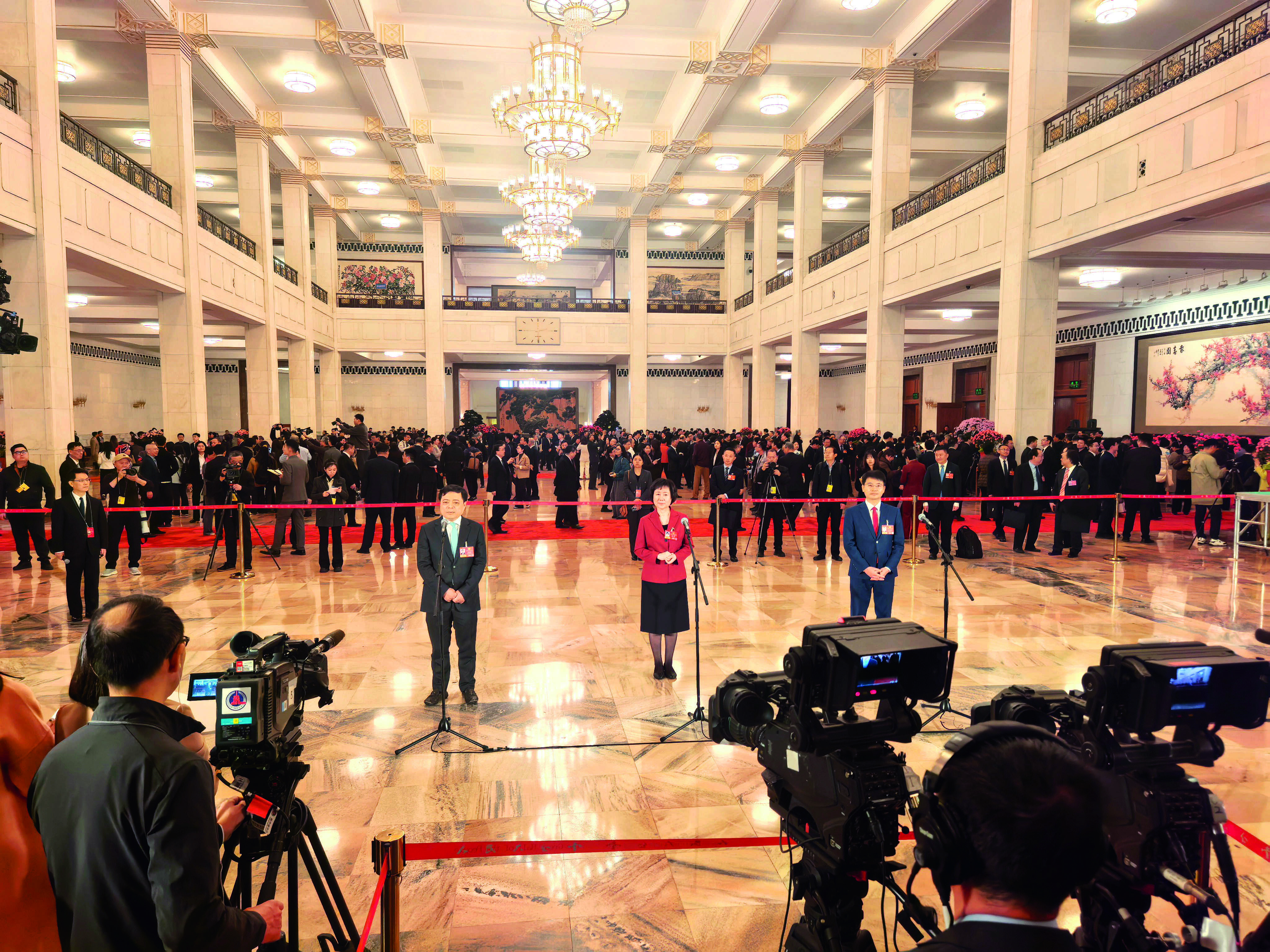 走进一层中央大厅,巨幅国画《报春图》映入眼帘。该画作以“红梅”元素展现“报春”主题,尽显新时代中国的生机与活力。开幕会前的等待时刻,委员们驻足画前热切交流。国画的生机与思想的跃动相互交融,勾勒出自然之春与发展之春交相辉映的生动画卷。