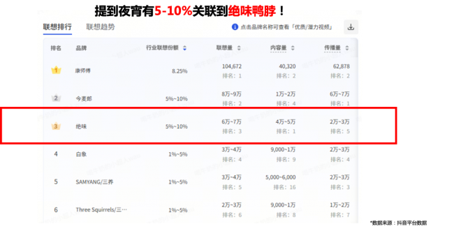 此次战略合作,是双方基于对年轻消费市场的深度洞察,历经多轮场景化合作试水后的必然成果。早在 2025 年 7 月,绝味便与可口可乐品牌借 “绝味夜宵节”开启首次联动,以“加 2 元得 2 瓶饮品”的加价购模式切入夜宵消费场景,精准契合消费者吃卤味配饮品的核心需求,短短两个月内便创下火爆热销的亮眼成绩,成功实现夜宵消费心智占位。彼时在社交媒体上,提及夜宵的用户有 5%-10% 会自然关联到绝味,该数据不仅位居卤味行业首位,更跻身食品饮料行业前三,充分验证了“卤味 + 饮品”消费组合的市场契合度与巨大发展潜力。
