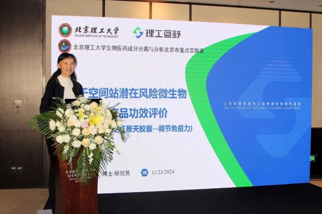 北京理工大学生物医药成分分离与分析北京市重点实验室研究员辛念在学术报告中,概括介绍了“基于空间站潜在风险微生物防护产品功效评价”的项目背景和研究内容,以及针对实验产品——航天东方红牌灵芝红景天胶囊将实施的具体方案,以研究其调节免疫力的功能和作用机制。