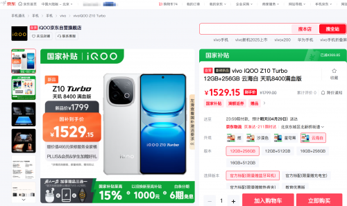 4月28日,iQOO Z10 Turbo系列和iQOO Z10x发布,iQOO Z10 Turbo系列售价1799元起,iQOO Z10x售价1099元起,均已开售。为带给消费者更多权益,京东携手iQOO打造先人一步加速换新计划,下单iQOO Z10 Turbo系列可享权益随心选,包括限量TWS A2蓝牙耳机、限量快充充电宝、限量散热背夹在内,权益三选一。目前,京东已同步开售iQOO Z10 Turbo系列,享国家补贴15%,到手价1529.15元起,可叠加以旧换新至高补贴1000元,还可享6期免息、赠价值466元保修服务全家桶(一年延保+三年电池宝+一年碎屏宝+一年后盖宝)、直播间下单赠双肩包、认证学生赠快充充电宝、PLUS/店铺会员赠iQOO影音耳机(PLUS/学生/店铺会员互不叠加)、晒单至高返50元京豆。