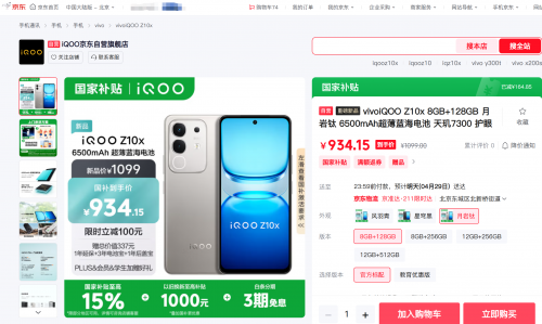 京东也同步开售iQOO Z10x,享国家补贴15%,到手价934.15元起,可叠加以旧换新至高补贴1000元,还可享3期免息、赠价值337元保修服务三件套(一年延保+三年电池宝+一年后盖宝)、认证学生赠小度音箱、PLUS/店铺会员赠影音耳机(PLUS/学生/店铺会员互不叠加)、直播间下单赠双肩包、晒单至高返50元京豆。