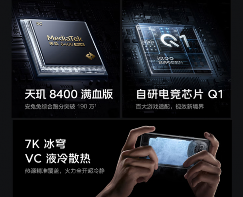 iQOO Z10 Turbo系列分为iQOO Z10 Turbo和iQOO Z10 Turbo Pro。其中,iQOO Z10 Turbo搭载天玑8400满血版,配置LPDDR5X + UFS 4.1,性能优异;配置帧率感知引擎,适配热门手游高帧率画质;同时搭载自研电竞芯片Q1,支持自研游戏超分算法,带来更细腻的画面,支持新一代低时延游戏超帧,高帧率、低功耗、低时延兼备,游戏体验更好;采用7K冰穹VC液冷散热,高性能持续稳定输出。此外,iQOO Z10 Turbo支持《暗区突围》全地图移动光追,通过KPL比赛用机测试认证,还带来手汗优化、保护壳优化、钢化膜优化,触控更好,更有4D游戏振感,游戏体验更上一层楼。