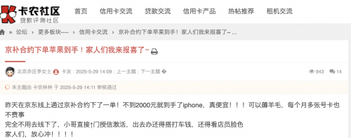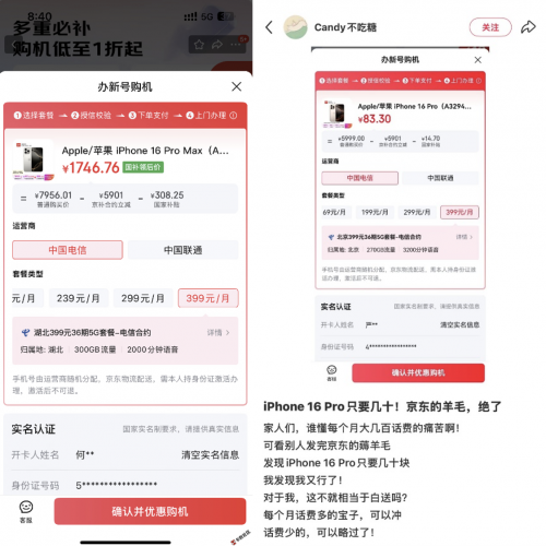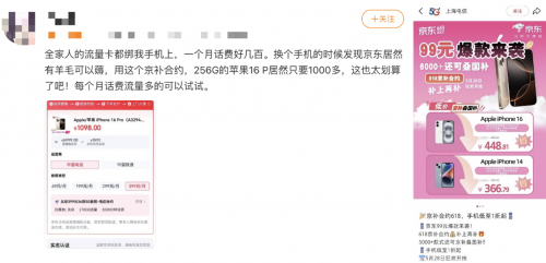 在小红书、微博等平台,也有网友晒出了自己通过“京补合约”买iPhone 16 Pro的截图。原价5999元的手机,京补合约直接立减5901元,再叠加国家补贴,只花不足百元就能拿下。与此同时,也有官方运营商晒出了“618京补合约”的活动,最低只需99元/月,网友们可根据自己的话费情况进行选择。这一系列优惠信息被曝光后,迅速在微博、小红书、论坛以及贴吧等社交平台传播,不少网友准备着手一试。