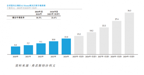 全球AI Home市场正迎来爆发期。据弗若斯特沙利文数据,面向企业级客户的解决方案规模,已从2020年66亿美元增至2024年130亿美元,预计2029年将达343亿美元,未来五年复合增长率21.4%。