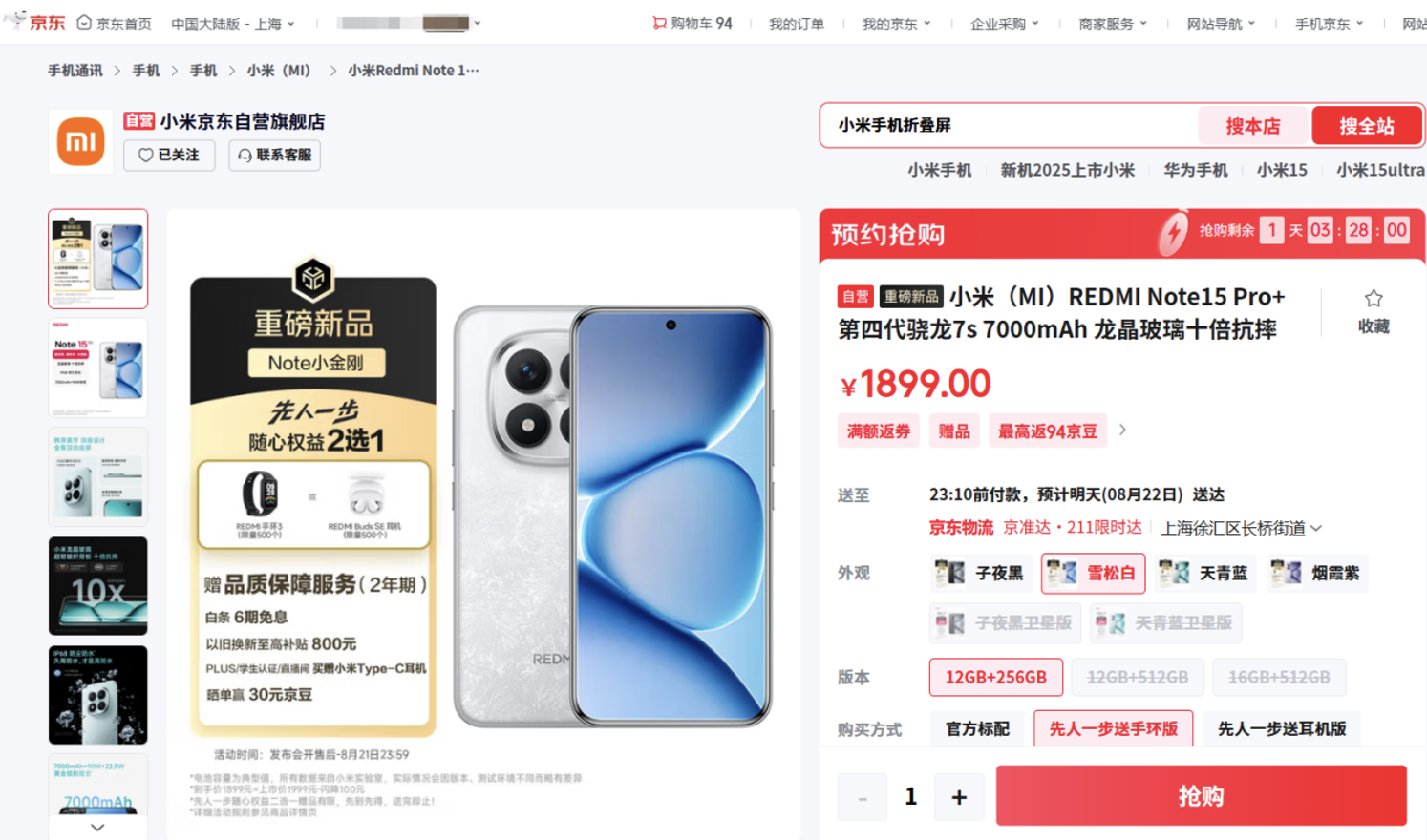 8月21日,REDMI Note 15系列正式发布,售价999元起,现已开售。为带给消费者更多权益,京东携手小米打造先人一步加速换新计划,先人一步下单REDMI Note 15 Pro+ 12GB+256GB版本可享权益随心选,包括限量REDMI Buds SE、限量REDMI手环3,两项权益任选其一。目前,京东已同步开售REDMI Note 15系列,下单REDMI Note 15享买赠小米Type-C耳机、PLUS会员尊享180天只换不修、晒单赢10元京豆等福利,下单REDMI Note 15 Pro系列可享6期免息、买赠品质保障服务(2年期)、以旧换新至高补贴800元、PLUS/学生认证/直播间买赠小米Type-C耳机、晒单赢30元京豆等福利。
