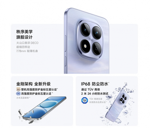 REDMI Note 15 Pro搭载小米龙晶玻璃,更坚固可靠;通过SGS 2米反复跌落测试,获得SGS整机高强度防护金标五星认证、CQC高强度防护金标五星认证、TÜV南德五星长效防水品质认证,支持IP68防尘防水,支持湿手触控2.0,更耐用。REDMI Note 15 Pro延续经典的秩序对称美学,采用全新火山口造型DECO,带来子夜黑、雪松白、天青蓝、云霞紫四款配色。