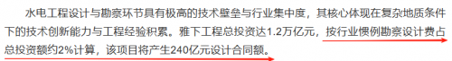 此前,雅鲁藏布江下游水电工程已经正式开工,总投资约1.2万亿。其中,按照行业惯例,勘察设计费大约占总投资额2%左右,也就是240亿。这个规模,大约是勘设股份2024年总营收的16倍。