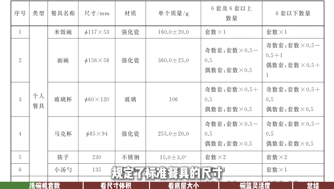 目前,洗碗机容量普遍以“套数”作为衡量标准。在一般消费者认知中,套数越大代表可清洗的餐具数量越多。依据国家标准GB/T 38383-2019《洗碗机能效水效限定值及等级》的规定,洗碗机额定装载的“标准餐具”数量,需以中式餐具为基础计算。这一标准的初衷,是让所有品牌处于同一起跑线,同时也让碗篮设计能更贴合大多数中国家庭的使用习惯。