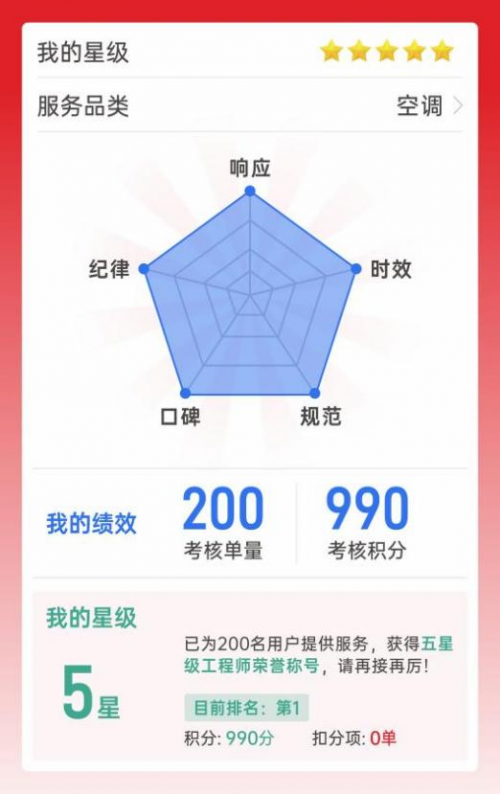 TCL空调在国内已打造了两大呼叫中心、5000+家服务商、30个战区服务中心和4个大区后台,共同构成了TCL空调庞大的服务网络体系。基于这一网络,TCL空调推出了行业首个服务能力量化评估模型——“五星级工程师认证体系”,也就是TCL空调星服务标准体系,通过五维动态评估机制,全面覆盖服务响应、时效、规范、用户口碑和工作纪律。