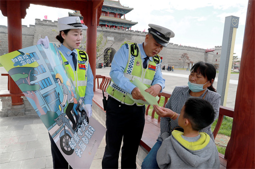 10月8日,运城市公安局盐湖分局交警大队宣传科和一中队辅警积极推进“百日行动”大宣传活动,深入辖区主干道商店、超市、景区等人流、车流密集区域,通过发放《交通安全倡议书》、宣讲佩戴安全头盔宣传挂图、赠送印有安全提示语手提袋的形式,将交通安全知识传递给广大交通参与者,提高大家安全出行意识。