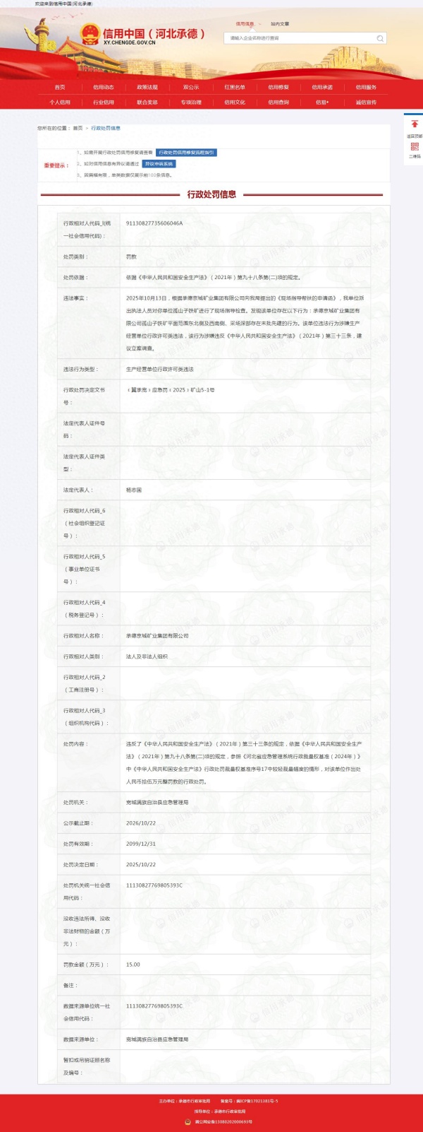 据信用中国(河北承德)官网消息,行政处罚决定文书号【﹝冀承宽﹞应急罚﹝2025﹞矿山5-1号】显示,处罚决定日期是2025年10月22日;