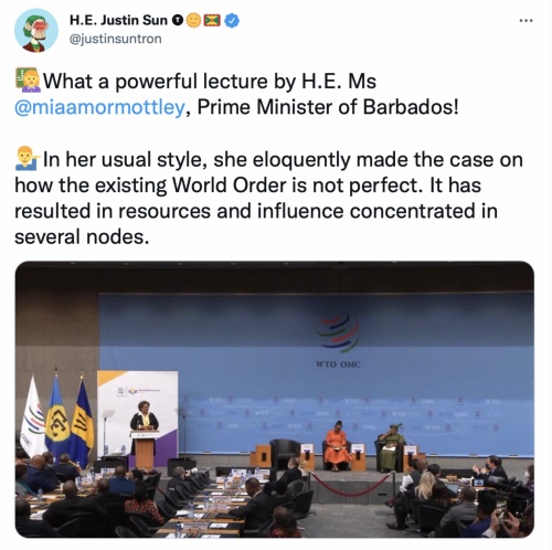 3月24日,格林纳达常驻世界贸易组织代表、特命全权大使孙宇晨(Justin Sun)发布推特表示,应世界贸易组织(WTO)总干事伊维拉(Ngozi Okonjo-Iweala)邀请,在线出席了首场世贸组织首脑系列讲座。他表示,巴巴多斯总理米娅·莫特利(Mia Amor Mottley)以有力的演讲阐述了现有世界秩序的不完美之处,目前的世界秩序使资源和影响力只集中在几个国家,其余许多发展中国家由于缺乏获取途径而不得不面对更严峻的问题。
