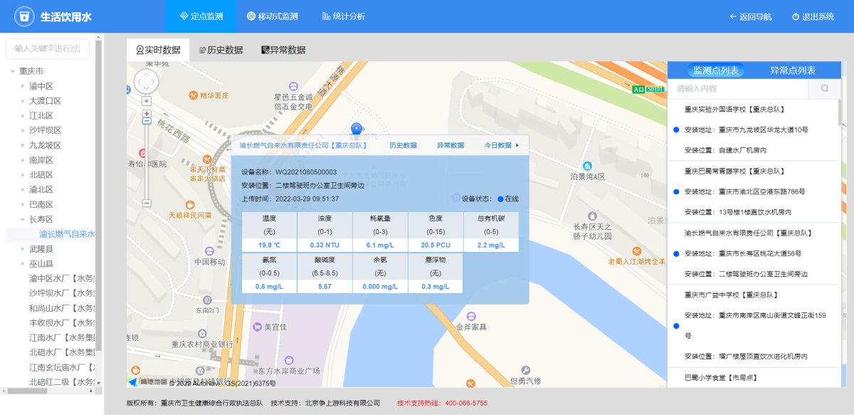北京争上游科技承建的重庆市生活饮用水水质在线监测系统平台