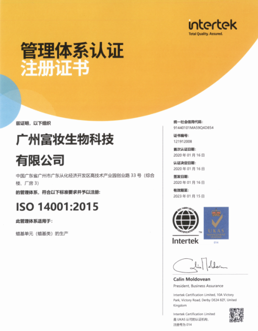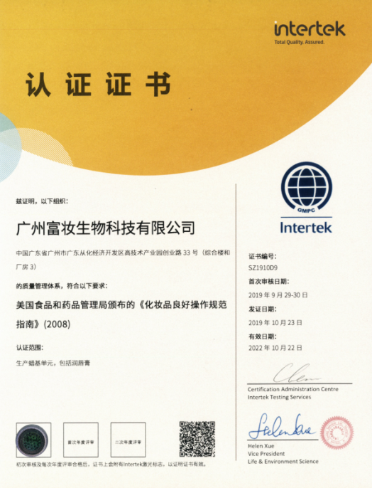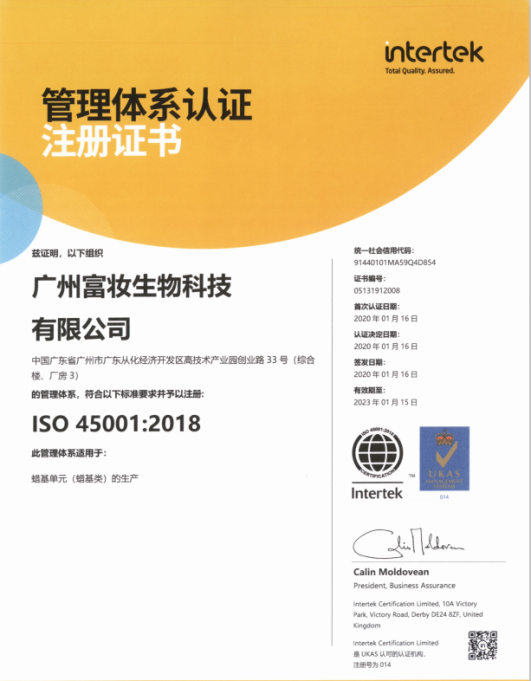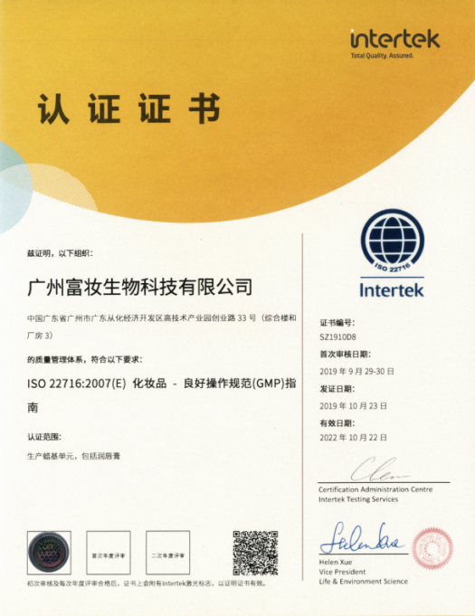 通过了ISO22716、GMPC、ISO45001、ISO9001、ISO14001五大国际标准体系认证。