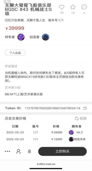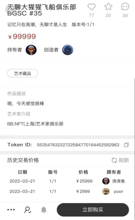 这些作品分为单版和多版两种发售形式,其中单版发售价格为2999.多版一共20版,每版399.499不等,每次的发售都是瞬间售空,不乏有人会以高价进行二次购买,且高价购买的人并不占少数,而是有很多藏家愿意出高价购买。甚至一天的交易额轻轻松松破万,而这些数据更加直观地说明了“无聊大猩猩BGSC ” 的火热程度,一个作品的成功并不是偶然的,而当其具备了成为火热爆款的条件时,成功便是必然的。那么“无聊大猩猩BGSC ” 为什么会这么的火爆呢,下面从两方面为大家揭秘“无聊大猩猩BGSC ” 为何成为国内NFT界的“爆款”。