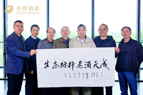 品评环节,专家组对舍得主要明星产品进行了专业品评鉴定,一致认为舍得酒品质突出。赖登燡还亲自提笔写下了“生态标杆,老酒天成”的墨宝,由专家团共同签名并将其赠予舍得酒业。