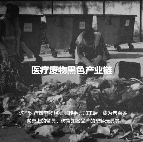 2012年,央视315曝光,广东汕头澄海区有垃圾回收站从医院收来医疗垃圾,并公开售卖。这些医疗垃圾经不良商家加工处理,被做成光鲜亮丽的玩具。4年后,南京市破获全市首起医疗废物污染环境案件,查实嫌疑人收购、倒卖医疗废物3000余吨,涉案价值4000余万元。这些医疗废弃物经层层转手、加工后,成为老百姓餐桌上的餐具、仿冒知名品牌的塑料玩具等。2019年,央视315再次曝光山东、河北、河南等地出现的类似犯罪行为。