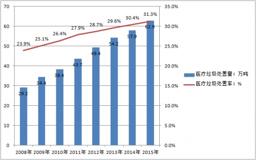 2008-2015年我国医疗垃圾处置量及处理率分析