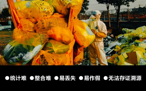 简单总结,传统医疗废弃物处理模式因为手工统计手段,导致信息和数据统计难、整合难,容易丢失、出错、弄虚作假,无法存证溯源。