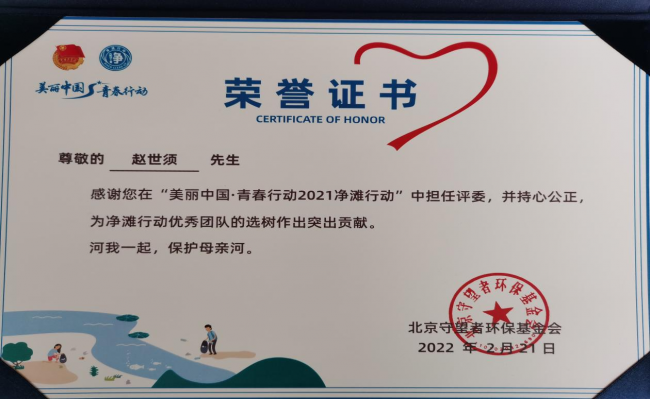 2021年3月22日,团中央社会联络部以世界水日为契机,发起了“美丽中国·青春行动”净滩行动。为响应团中央的号召,自去年4月份开始,赵世须带领叶县义工经常利用双休日在沙河边开展净滩行动,截至目前,已举办了9次,参加人数300余人(次)、捡拾垃圾3000余公斤。因工作成效突出,赵世须在“美丽中国·青春行动2021净滩行动”中担任评委,并获得荣誉证书。