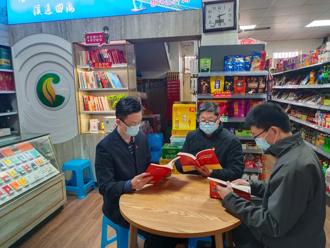 图为党员零售户徐华平(中)与客户经理党员一同开展政治理论学习。