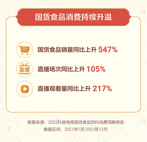 4月11日,抖音电商发布《2022国货食品饮料消费洞察报告》(下称“报告”)。报告指出,背靠抖音平台超6亿日活用户,兴趣电商为国货食品消费提供了群体基础。报告显示,平台消费者对国货食品的接受度更高,更愿意通过直播了解产品。过去一年,平台国货食品直播场次同比上升105%,直播用户观看量上升217%。