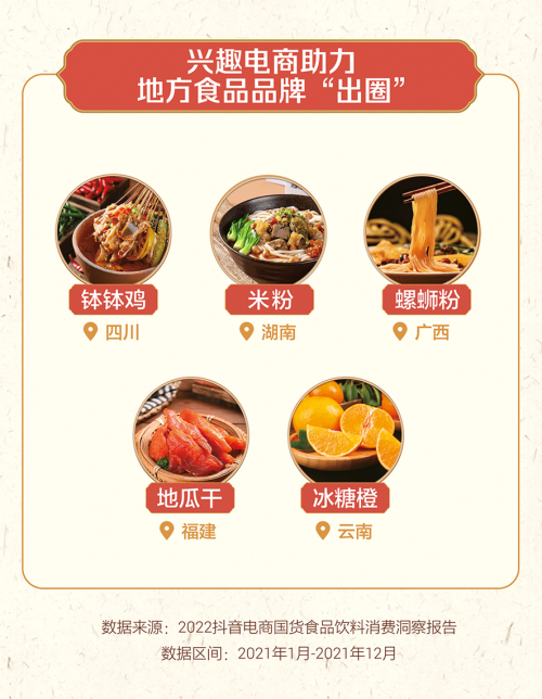 同时,在兴趣电商助力下,地方国货食品品牌频繁"出圈",受到消费者喜爱。如四川钵钵鸡、湖南米粉、广西螺蛳粉、福建地瓜干、云南冰糖橙等商品受到各地消费者认可。