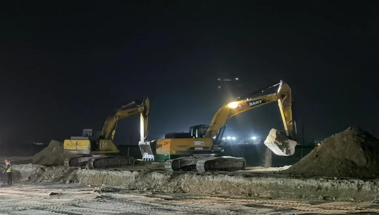 在莱州银海化工产业园项目施工现场,工人们紧锣密鼓地忙施工,抢进度,挖掘机、推土机的轰鸣声此起彼伏,运输车辆来回穿梭荡起滚滚烟尘,在昏暗灯光下,施工现场依然呈现出一派热火朝天的繁忙景象。截止目前为止,莱州银海化工产业园基础设施建设项目中,银山七路已完成路基填筑,横向管线开挖完成50%,银山六路已基本完成一层路基填筑,横向管线开挖完成20%,银海五路路基开挖完成40%。而在与设计和园区服务中心的对接下,其余工作也在有序进行。施工人员和现场机器采用掌灯的方式工作,昼夜施工不间断,以“昼加夜,白加黑”的工作模式,实现了“快节奏”和“加速度”,进一步提高了施工效率。