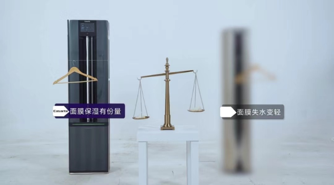 视频中可以看到,工作人员在天平两侧分别放置两片相同的面膜,而后面膜被分别挂在卡萨帝空调和普通空调的出风口前方。在同样开启25℃冷风、出风20分钟后,再次取下面膜放回天平,可以发现放在普通空调一侧的面膜明显比卡萨帝空调一侧更轻。这说明普通空调的单股风直吹,确实会让面膜失水减重。
