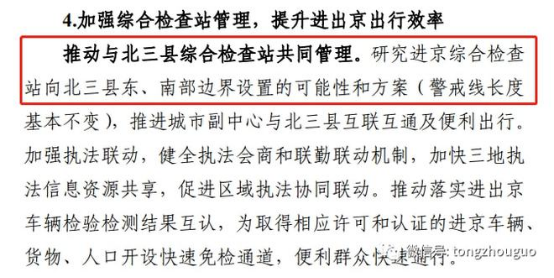 其中,在“加强综合检查站管理,提升进出京出行效率”方面提出:推动与北三县综合检查站共同管理。研究进京综合检查站向北三县东、南部边界设置的可能性和方案(警戒线长度基本不变),推进城市副中心与北三县互联互通及便利出行。加强执法联动,健全执法会商和联勤联动机制,加快三地执法信息资源共享,促进区域执法协同联动。推动落实进出京车辆检验检测结果互认,为取得相应许可和认证的进京车辆、货物、人口开设快速免检通道,便利群众快速通行。