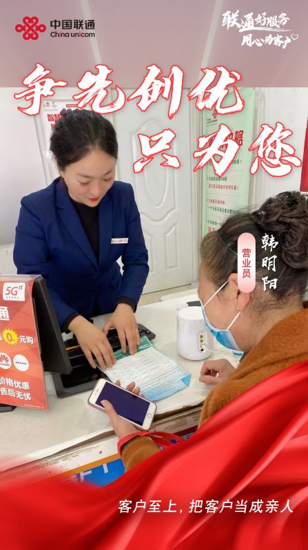 韩明阳是河南南阳联通的一名营业员,她把"客户至上"视为现实行动,将 "把客户当成亲人" 的贴心服务融入日常工作中。