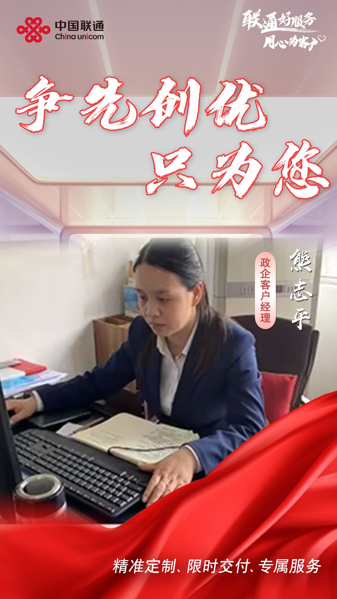 河南信阳联通政企客户经理熊志平,入职20年来,始终秉承“一切为了客户”的服务理念,对所负责的单位坚持长期走访,深度挖掘客户单位需求,对客户的问题耐心解答,以点滴积累赢得客户的信任与青睐。在一次日常拜访中,她敏锐地捕捉到客户单位有建设平台的需求,在公司团队和领导的支撑下,主动积极的对客户单位进行业务推荐,为其量身制定方案,为加快业务落地,她坚持每周上门拜访交流,并结合客户需求多次修改完善方案。经过6个多月的跟踪服务,最终成功签约,并在后期的服务中得到了客户高度认可。