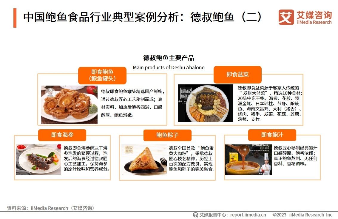 以行业头部品牌德叔鲍鱼为例。德叔鲍鱼是广州聚食广膳电子商务有限公司的旗舰品牌,自1988年成立以来,一直专注于鲍鱼、海参等高档海鲜菜品的研发与生产。德叔鲍鱼在全国推出率先常温保鲜即食鲍鱼,在即食鲍鱼行业内崭露头角,成为中国即食鲍鱼业内人气代表的品牌企业。以即食预制鲍鱼作为品牌的核心卖点,德叔鲍鱼的产品线不断拓展。目前,德叔鲍鱼拥有即食鲍鱼、即食盆菜等五大品类产品,每一种都以其独特的风味和精心的制作工艺赢得消费者的喜爱,较高的品牌影响力帮助企业获得更多的合作伙伴和消费者支持。